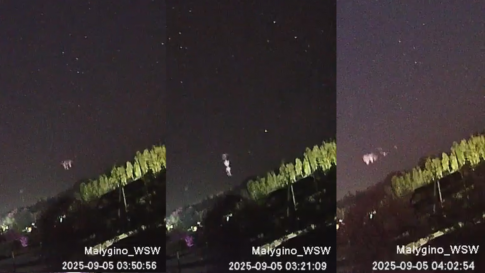 - «Я не перестаю удивляться. Снова спрайты, снова в сентябре. Я уже не понимаю как их можно поймать. Совершенно случайный момент в случайном месте, даже всполохов грозы за горизонтом не видно было. Это спрайты от грозы в Смоленской области на границе с Белоруссией».
