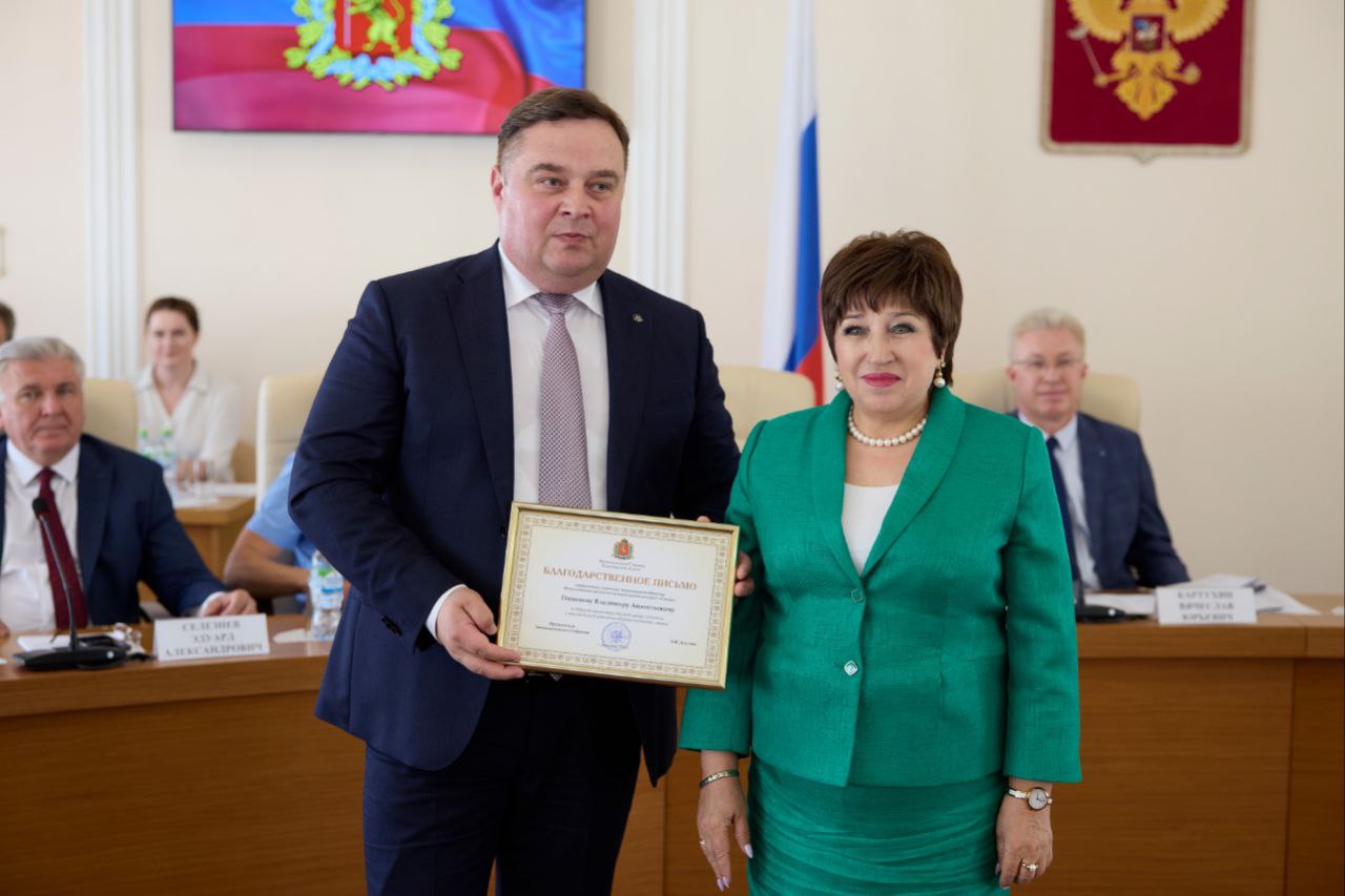 Председатель Законодательного Собрания Ольга Хохлова вручила Владимиру Пименову Благодарственное письмо, отметив его высокий профессионализм, личный вклад в укрепление обороноспособности страны и ответственное руководство одним из ключевых предприятий региона.