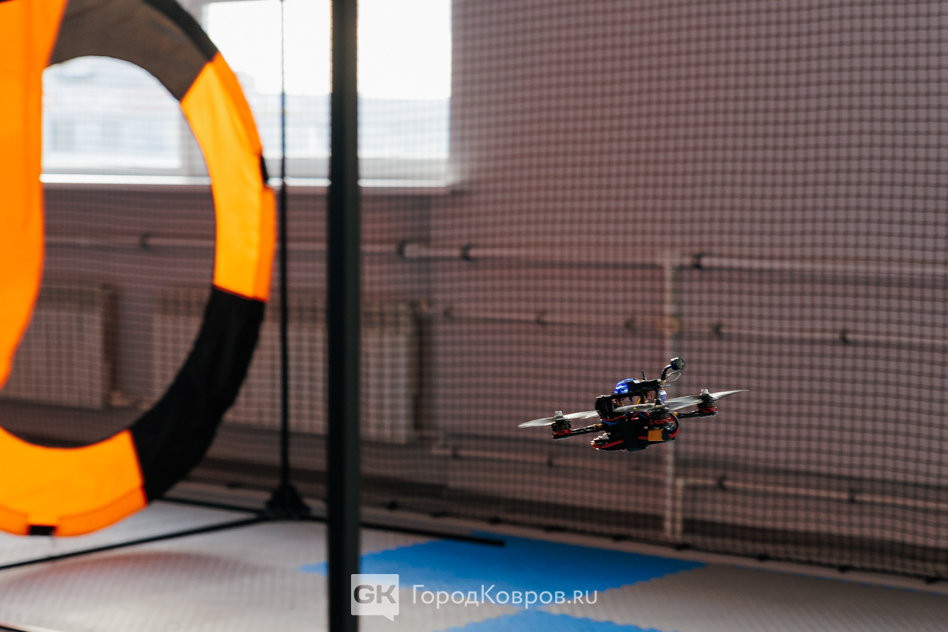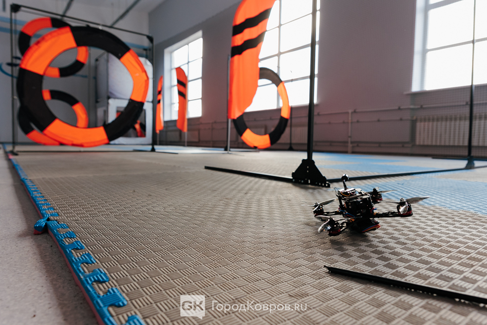 Николай и его ученики показали учебный класс, а затем мы прошли на закрытый полигон. Здесь проходят соревнования испытателей дронов. Управление идёт при помощи FPV, а полёт дронов на площадке чем-то напоминает кадры с чемпионата по квидичу.