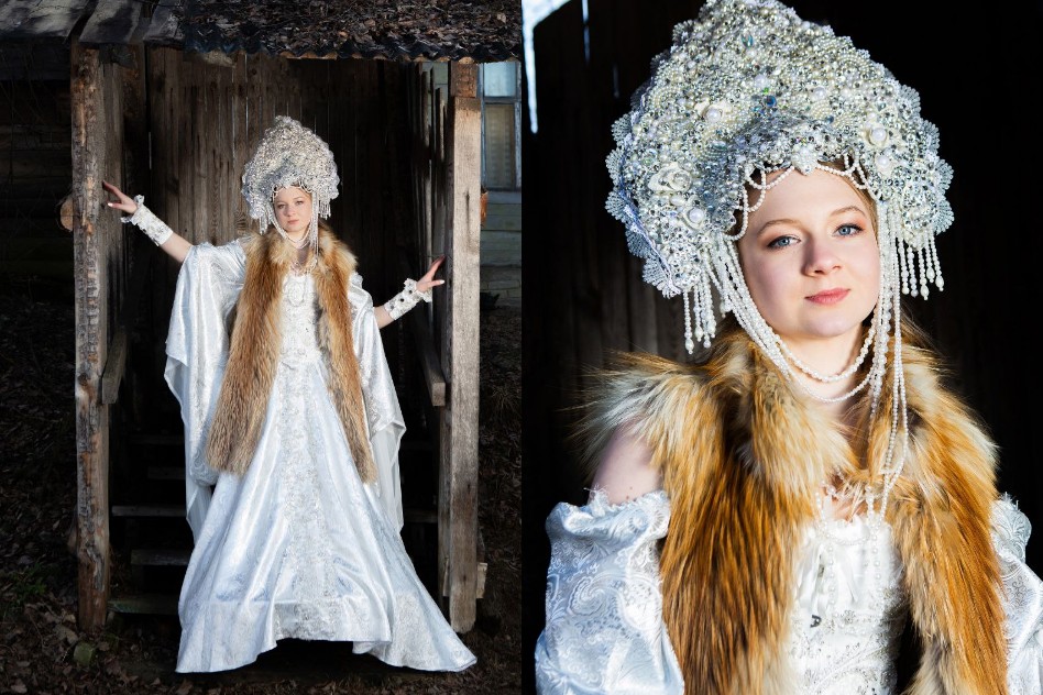 «Это получилось спонтанно. Для конкурса нужен был уникальный образ, и я решила не брать платье в аренду, а создать костюм самостоятельно. Помню, как папа помогал мне искать ткани на огромном рынке в Кыргызстане, а мама консультировала по дизайну. Вначале родился образ из белой парчи — «Царевна Лебедь». Потом была «Жар-птица»…