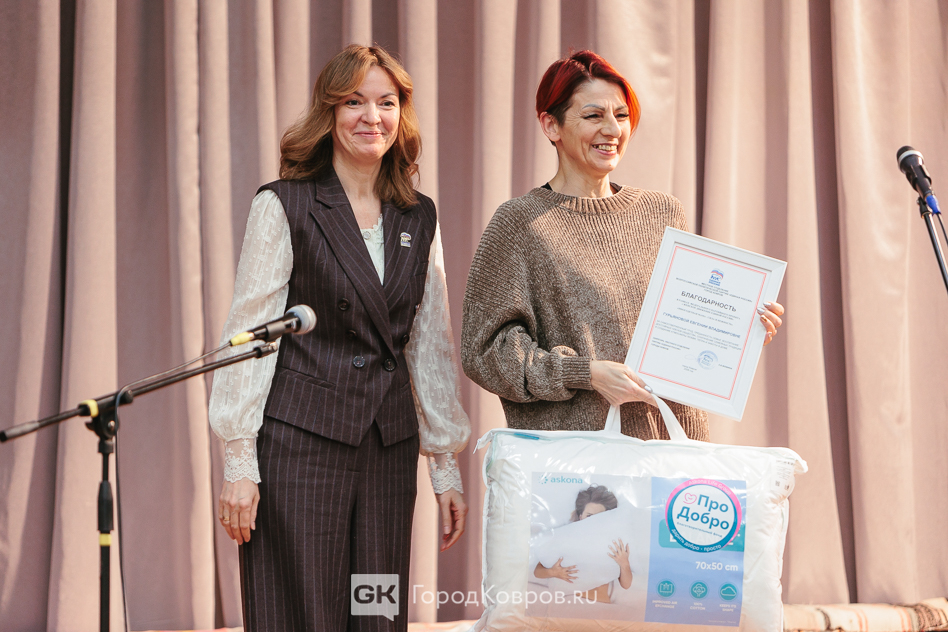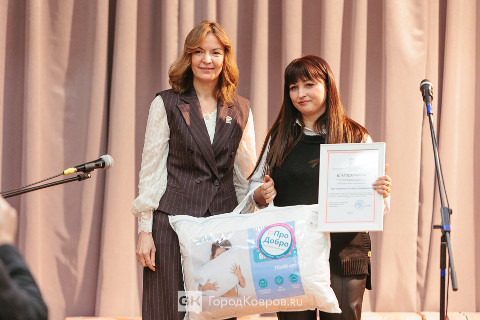 Евгения Гурьянова стала главной героиней вечера. Когда её вызвали для награждения, зал взорвался аплодисментами. У неё десять детей: семеро несовершеннолетних и трое взрослых. Сама она в Коврове всего пять лет, и о том, что в городе живёт такая удивительная семья, социальные службы узнали лишь недавно, когда Евгения оформляла пособие на младшую дочь.