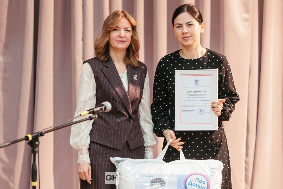 Затем состоялась церемония награждения. Благодарственные письма и подарки от партийного проекта получили несколько матерей. Среди них – Андрейкина Татьяна Геннадьевна, Балакова Наталья Владимировна, Ильязова Екатерина Владимировна, Айсина Анастасия Александровна. Но особые аплодисменты зала сорвала Евгения Гурьянова – мама, воспитывающая десятерых детей. Семеро из них ещё несовершеннолетние.