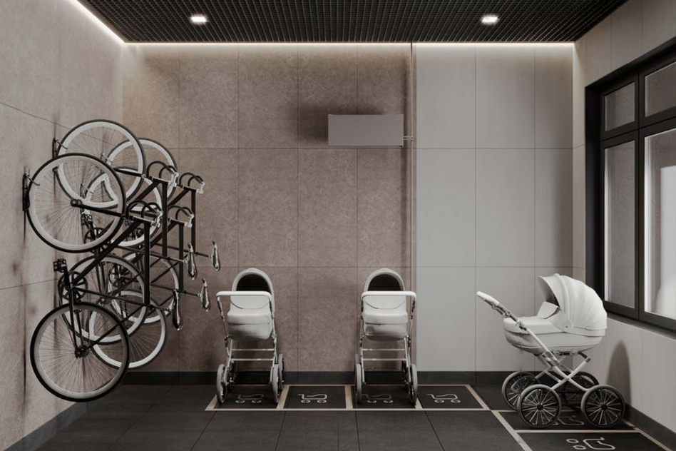 Интересная деталь проекта — келлеры на каждом этаже. Это небольшие хозяйственные помещения от 2,5 до 4,5 кв.м, которые можно приобрести вместе с квартирой. Здесь вы сможете хранить велосипеды, сезонные вещи, спортивный инвентарь и многое другое. Количество квартир в доме превышает количество келлеров, поэтому застройщик ввел правило «одна квартира — один келлер».