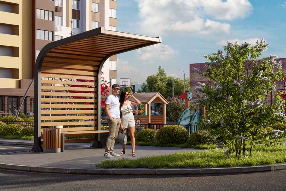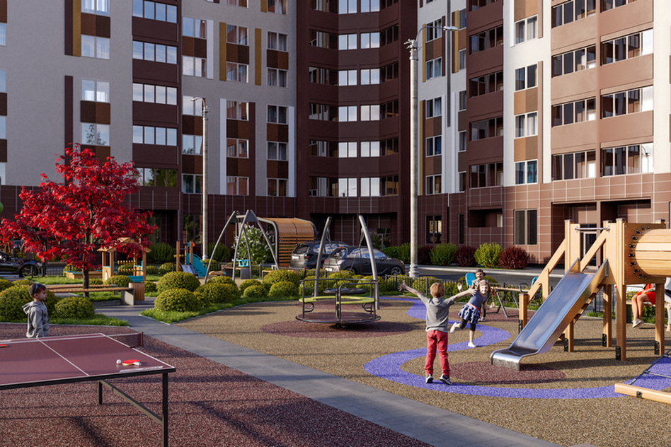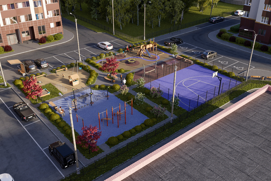 Досуговое пространство расположено между 2 домами, разделяя тем самым и внутренние проезды, чтобы дети гуляли спокойно, не боясь вылетевшего из-за угла автомобиля. Современные элементы детских и спортивных площадок не оставят равнодушными ни детей, ни подростков. А для взрослого населения обустроены уютные зоны для отдыха.
