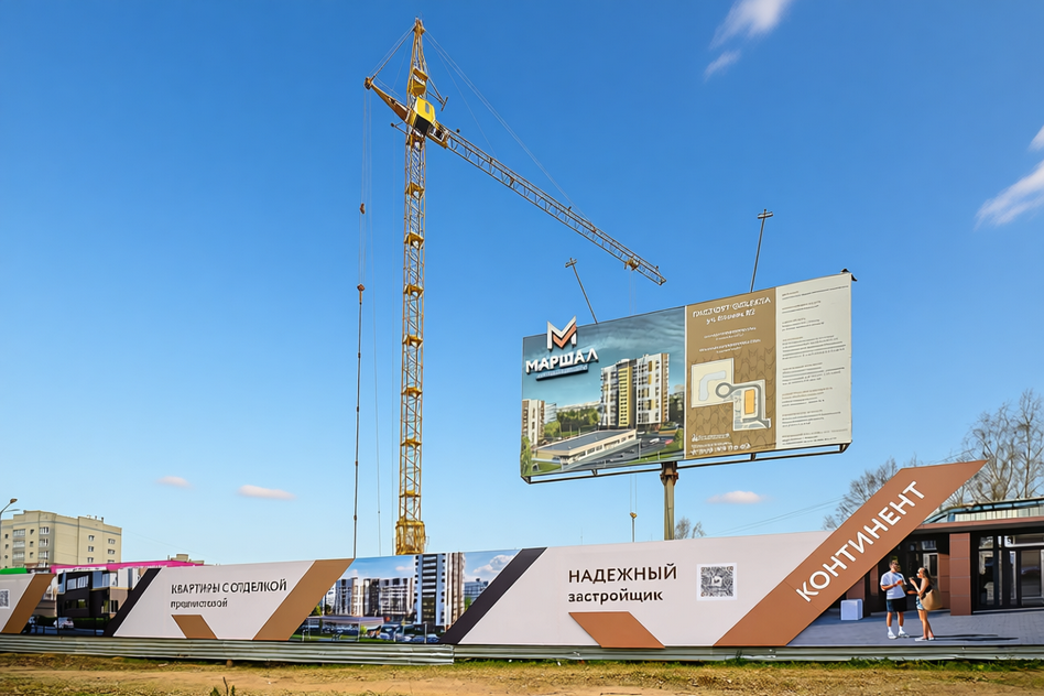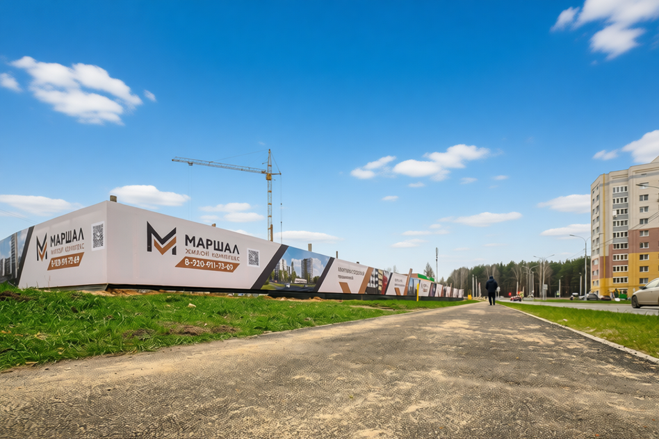 Интересно, что ограждение стройплощадки «Маршала» стало не просто забором, а полномасштабной информационной витриной. На баннерах размещены визуализации, основные преимущества проекта и QR-коды, ведущие на официальный сайт «Континента». Такой подход позволяет любому прохожему получить достоверную информацию и видеть, что компания открыта и прозрачна.