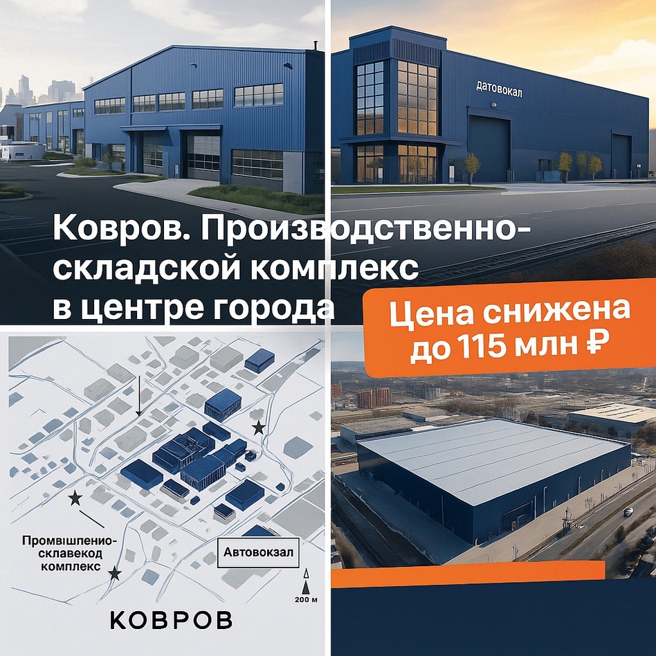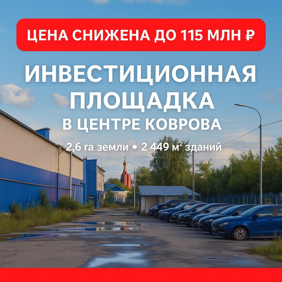В Коврове появилось уникальное предложение для инвесторов и представителей производственного бизнеса. На продажу выставлен производственно-складской комплекс с земельным участком 25 900 м² и зданиями общей площадью 2 449 м², расположенный в центре города, всего в 200 метрах от железнодорожного вокзала и автовокзала.