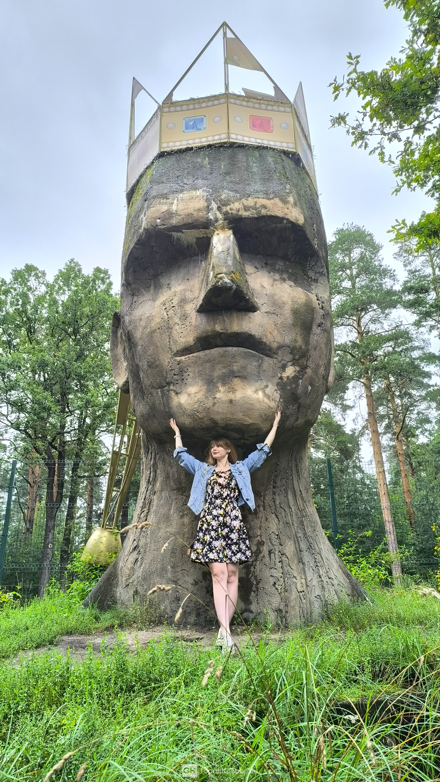 Сам истукан выполнен из бетона с теснением под дерево, на голове имеется элемент в виде короны. Кто-то говорит, мол, это смотровая площадка и даже лестница прилагается. Но если присмотреться, понимаем, что лестница несёт не более, чем технический характер, а наверху располагаются гирлянды.