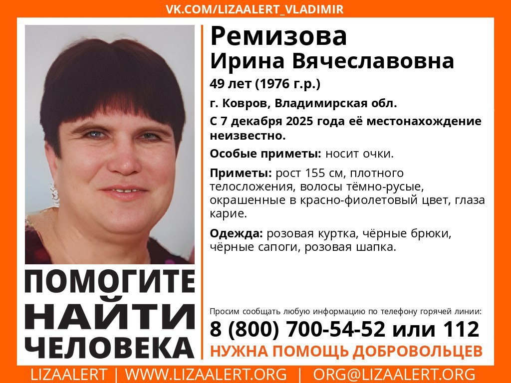 По последней информации, 49-летняя Ирина Ремизова была одета в розовую куртку и шапку, черные брюки и сапоги. Отличительные приметы: невысокий рост (около 155 см), плотное телосложение, темно-русые волосы, окрашенные в красно-фиолетовый оттенок, карие глаза. Пропавшая носит очки.