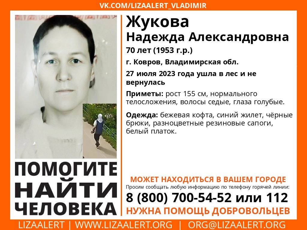 Поисковики LizaAlert сообщили о том, что 27 июля ушла и не вернулась 70-летняя жительница Коврова Надежда Жукова.
