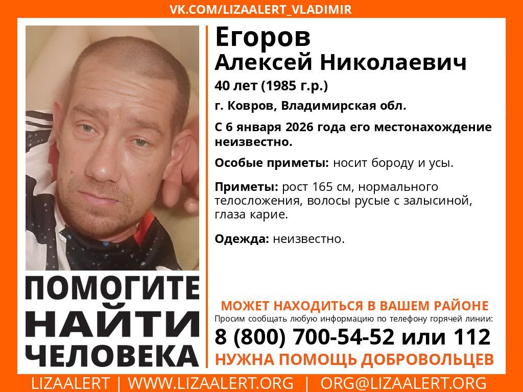 С 6 января 2026 года родные и друзья не могут найти 40-летнего Алексея Егорова, жителя города Ковров Владимирской области. Об его исчезновении сообщили волонтёры поискового отряда.