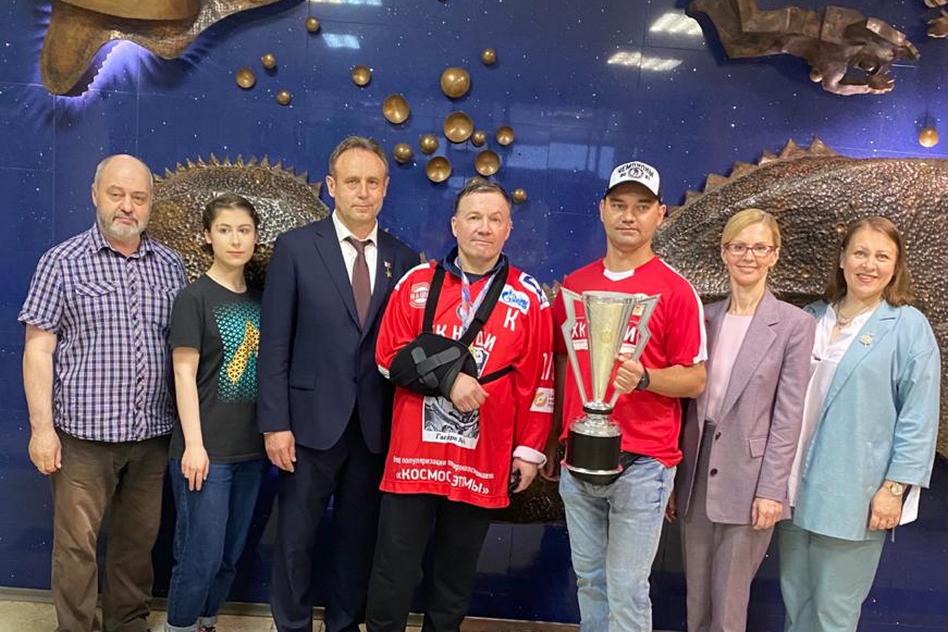 В этом кабинете состоялось чествование хоккейной команды «Наши» ЗАТО «Звёздный городок». Накануне хоккеисты выиграли «Кубок Созвездий» в городе Сочи среди любительских команд, обыграв в финале дивизиона ночной лиги сборную журналистов «РосПресса».