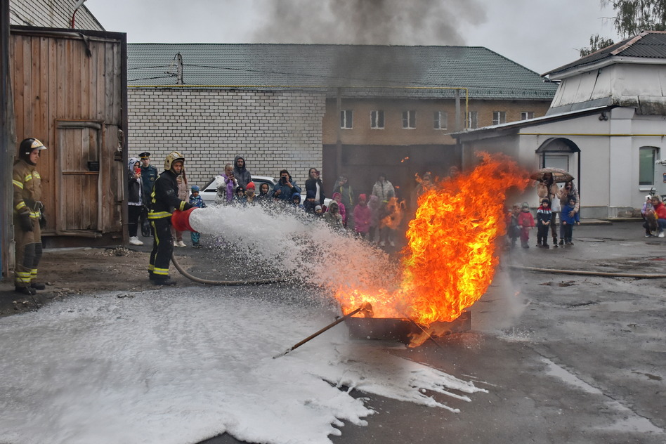 Кульминацией Дня открытых дверей стало показательное тушение пожара пеной, с использованием генератора пены средней кратности ГПС-600. Хлопья воздушно-механической пены, поборов пламя, разлетались во все стороны, веселя детвору.