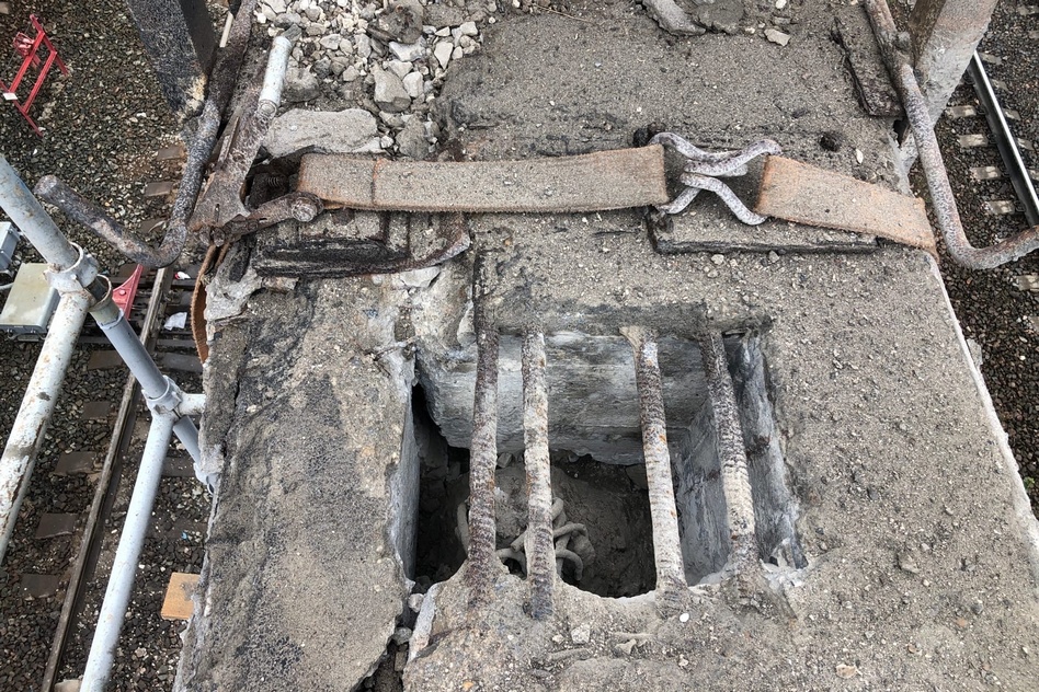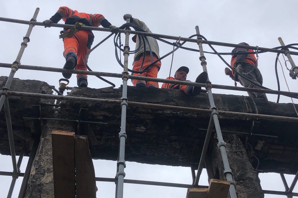 В первой половине дня одна бригада занималась бетонными работами, а вторая готовила пятую опору к демонтажу. Мне много приходилось видеть за свою практику, но такое состояние бетонной конструкции — впервые. Это просто жесть! Как она раньше не развалилась, я не понимаю….
