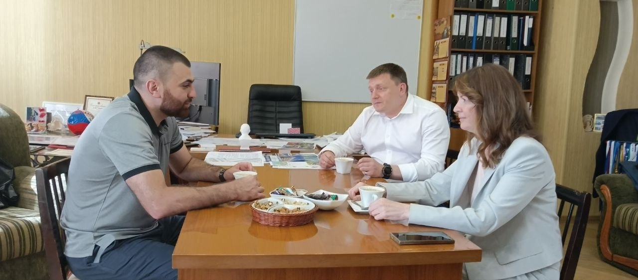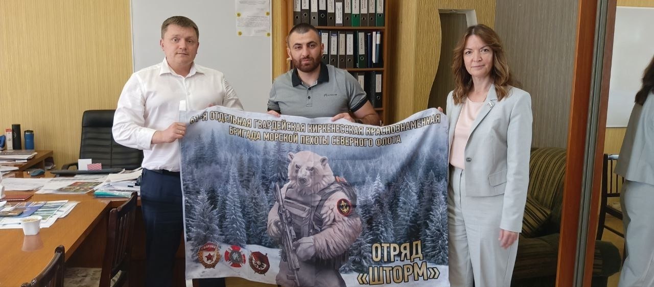 На встрече с главой города Сергеем Сидориным и председателем Совета народных депутатов Еленой Фоминой Степанян поделился историями из службы и привёз с собой особый подарок — боевое знамя отряда «Шторм».