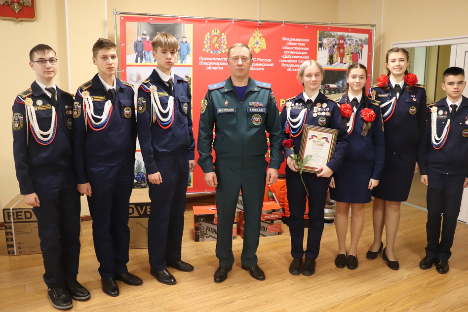 Председатель совета Владимирского областного отделения Всероссийского добровольного пожарного общества вручил почётную грамоту за 2 общекомандное место по ЦФО за победу в конкурсе «Лучшая дружина юных пожарных России» клубу юных пожарных «Бранд» МБОУ СОШ №8 Коврова.