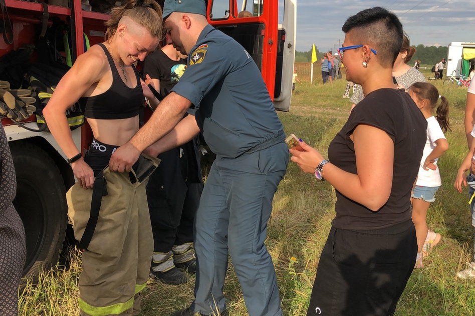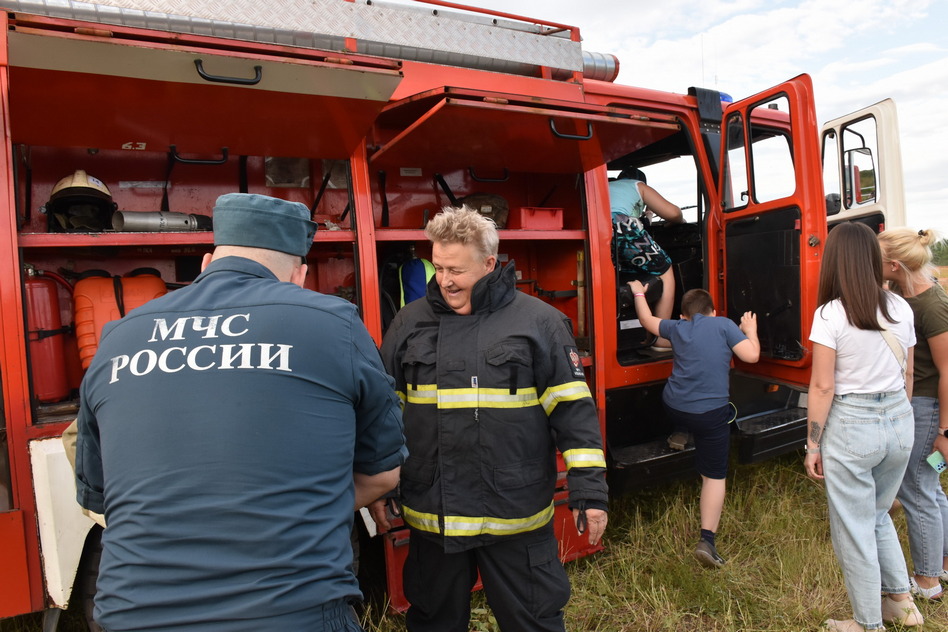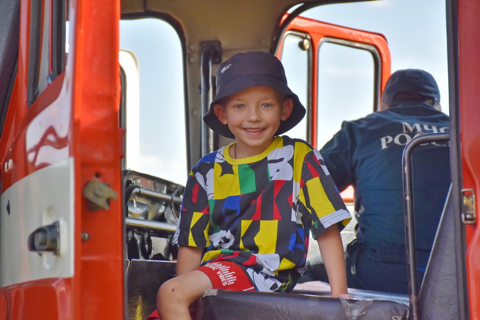 Пожарный Николай Репкин воодушевленно проводил настоящую экскурсию каждому, кто подходил к машине. Взрослые интересовались внутреннем устройством техники, и работой дыхательных аппаратов, девушки с удовольствием позировали в боевой одежде пожарных, дети сидели в кабине боевого расчета, изучали пожарные стволы, примеряли каски.