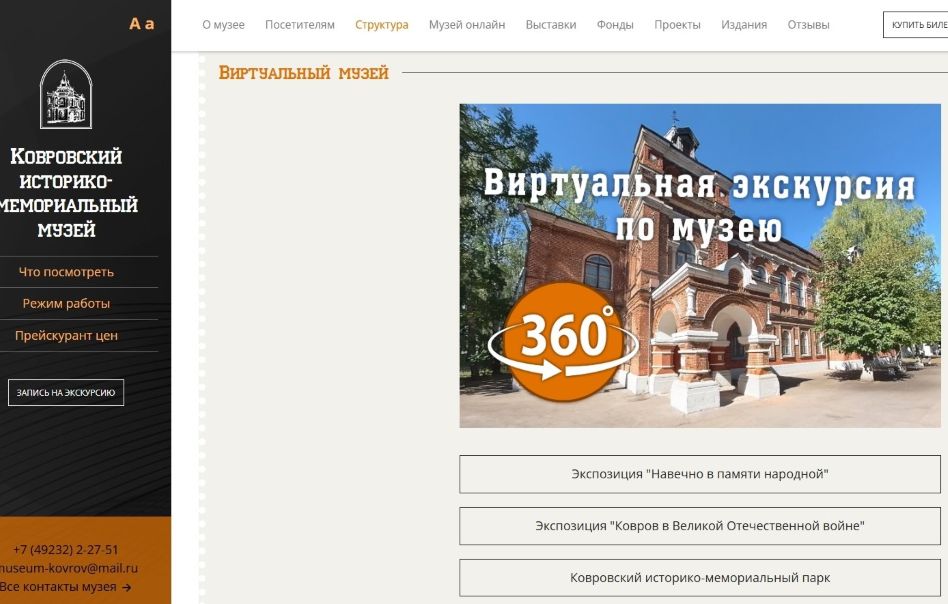 На интерактивной 3D-экскурсии уже можно побывать, зайдя на сайт Ковровского историко-мемориального музея. В неё входят постоянные экспозиции, которые располагаются на первом этаже.