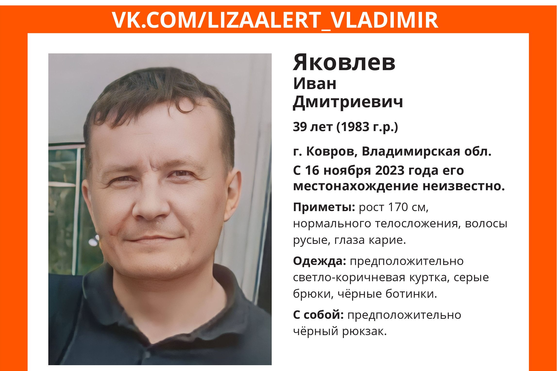 Иван Яковлев житель Коврова о его местонахождении ничего не известно с 16 ноября. Волонтеры ищут ковровчанина уже 2 недели.