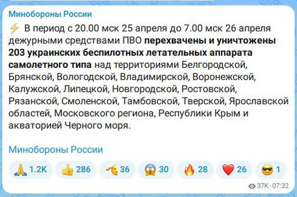 В ночь с 25 на 26 апреля российские средства противовоздушной обороны перехватили и уничтожили 203 украинских беспилотных летательных аппарата самолётного типа. Об этом сообщило Министерство обороны России в своем официальном канале.