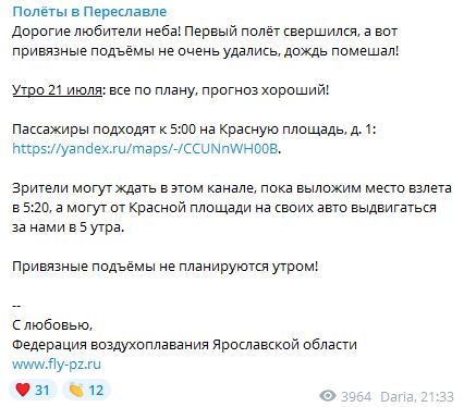 Впоследствии организаторы извинились перед незадачливыми воздухоплавателями в телеграм-чате. На сегодня, 21 июля, от полётов в Суздале организаторы решили отказаться.