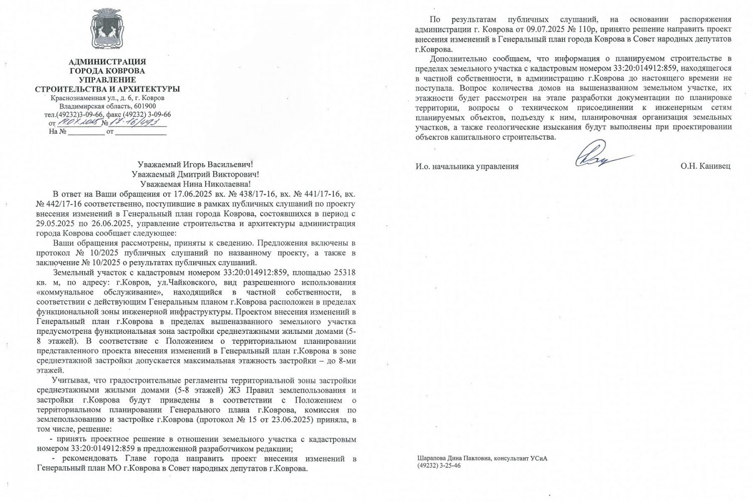 Достаточно изучить письмо-ответ (скриншот приведён выше), чтобы понять: стройке быть. Мнение жителей, конечно, выслушали и даже приобщили «к материалам дела». Но аргументация ковровчан работникам мэрии не показалась настолько впечатляющей, чтобы в генплане обозначить территорию, например, как будущий сквер. Всё по-прежнему — многоквартирные дома.