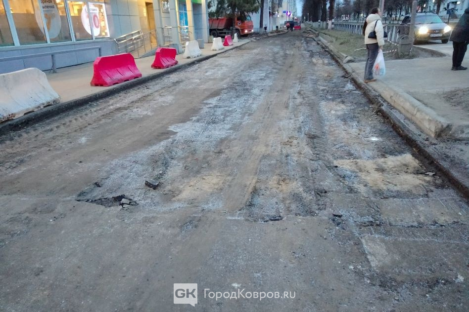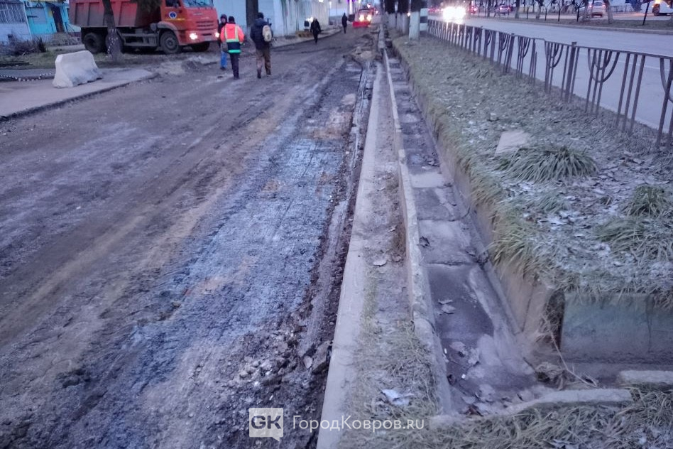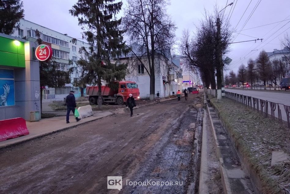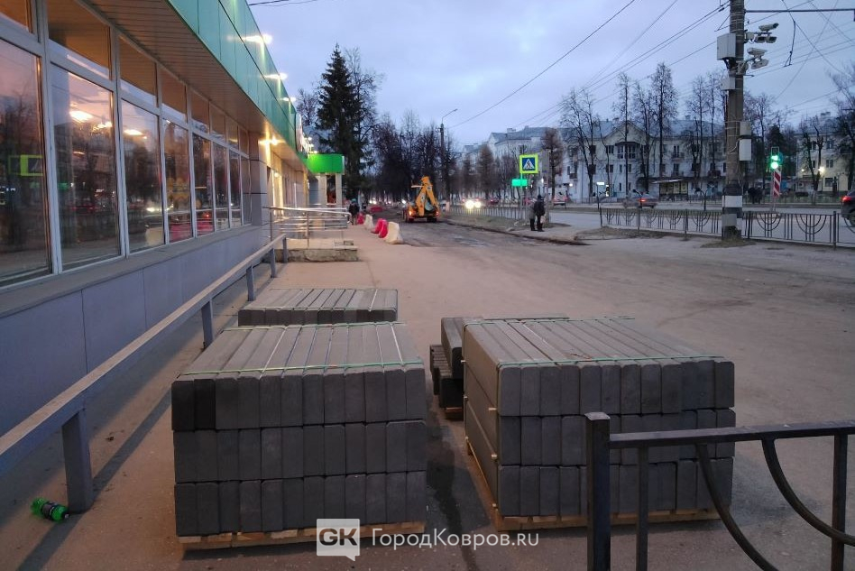 Работа началась в выходные. Тяжёлая техника и рабочие аккуратно «счистили» старый слой. Сейчас выравнивают поверхность. Сначала шли разговоры, что весь тротуар «закатают» в асфальт. Однако ка минимум часть вновь выложат брусчаткой – её уже привезли. Только бы «дорогие ковровчане» не растащили раньше времени. Надеемся, на супермаркете и на самом проспекте есть камеры!