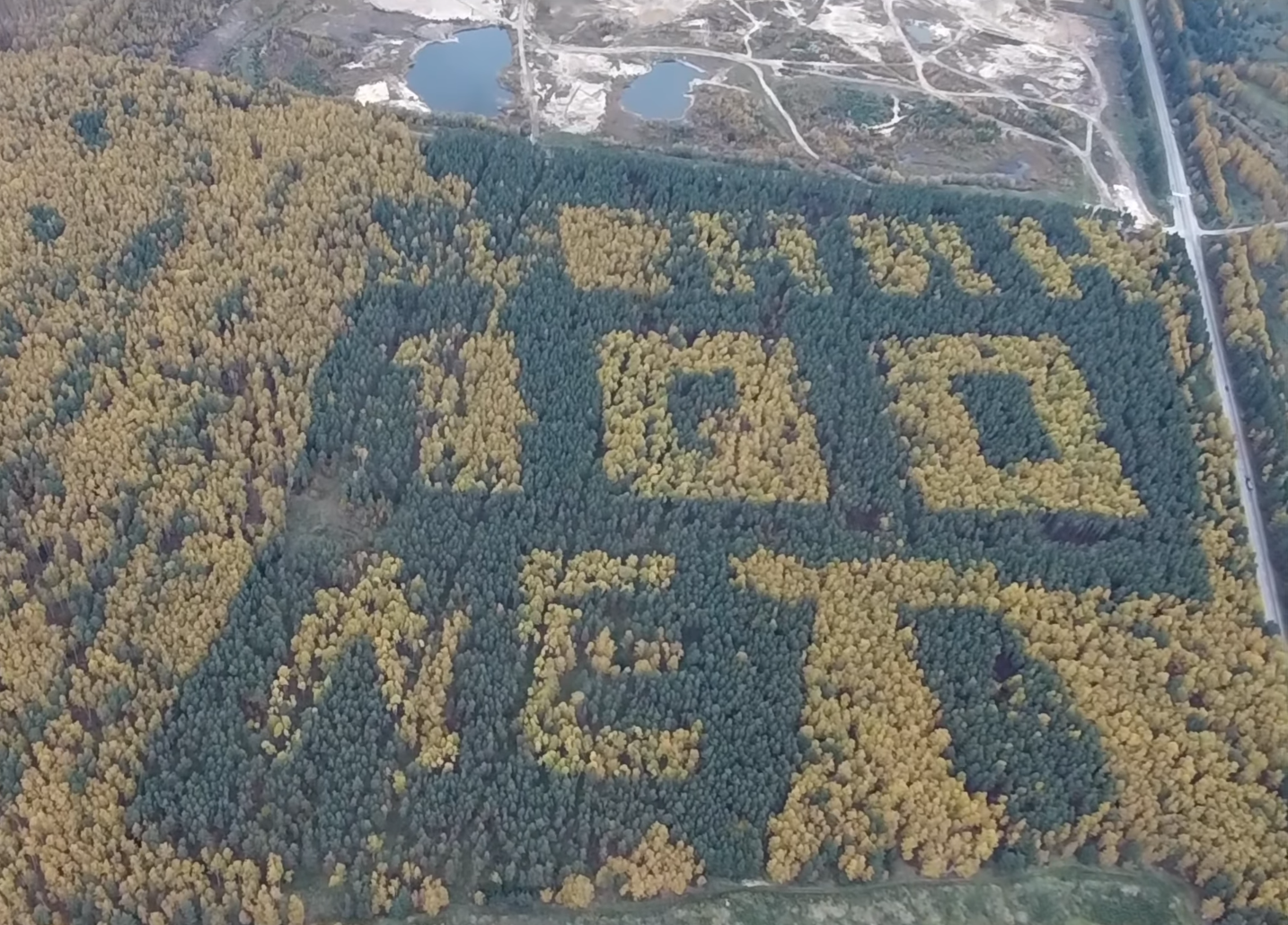 «Есть под Владимиром забавный лес. На нем написано, что Ленину 100 лет. Вот прямо такая надпись из деревьев, которую увидеть можно только с воздуха. Да и то, не всегда, а только осенью. Летом и весной все деревья зелёные, а зимой без листьев. И только осенью лиственные деревья желтеют и на фоне вечнозеленых ёлок проступает надпись «ЛЕНИН 100 ЛЕТ». Придумал это всё и реализовал в 1968 году заслуженный лесовод, академик А.Т. Каширский. А я этот лес обнаружил совершенно случайно на снимках со спутника и снял его на видео с дрона.» — делится Илья под своим видео