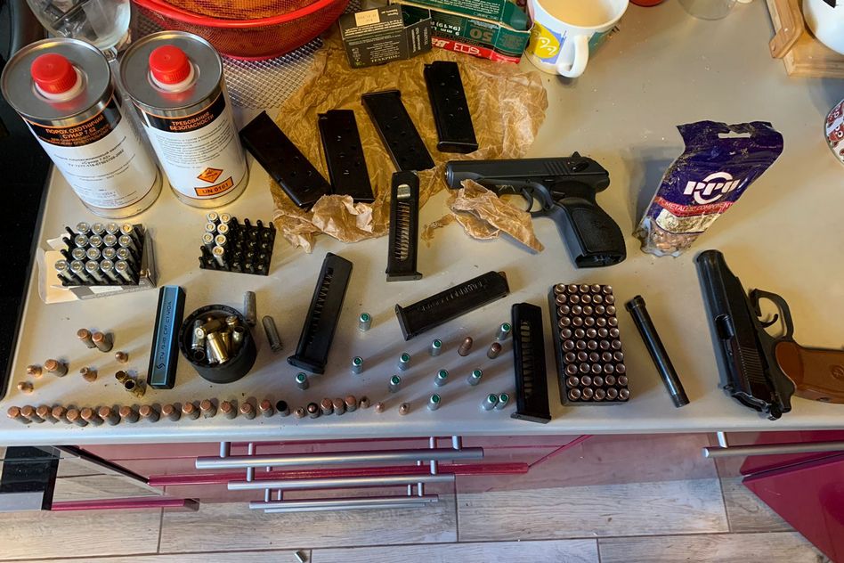 В результате проведенных в одном из принадлежащих обвиняемому нежилых помещений оперативно-розыскных и следственных действий, сотрудниками УФСБ России по Владимирской области обнаружены и изъяты из незаконного оборота: 2 пистолета калибра 9мм (самодельно изготовленные из охолощенных пистолетов ПМ), более 100 патронов различного калибра, основные части к пистолету ПМ (ствол калибра 9мм, УСМ), около 1 кг пороха, пули, капсюля, гильзы, а также оборудование для модернизации средств поражений.