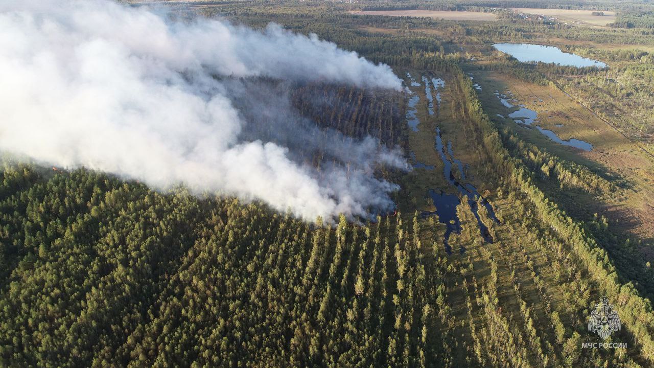 «Очаг пожара расположен в болотистой труднодоступной местности, в 5.1 км северо-западнее деревни Тереховицы. На месте работают порядка 14 пожарных и 3 единицы техники. Погибших и пострадавших нет».