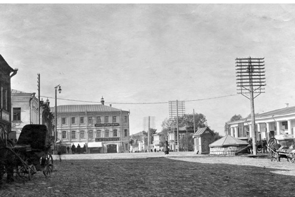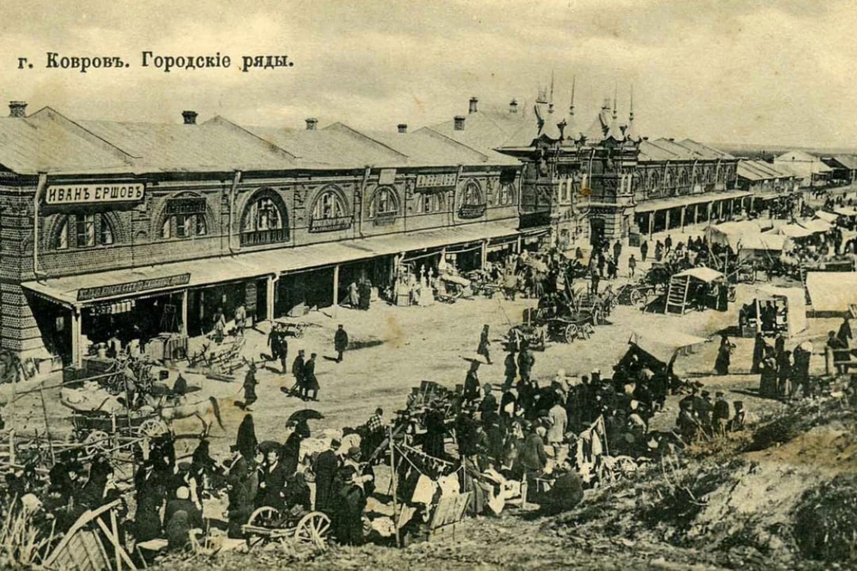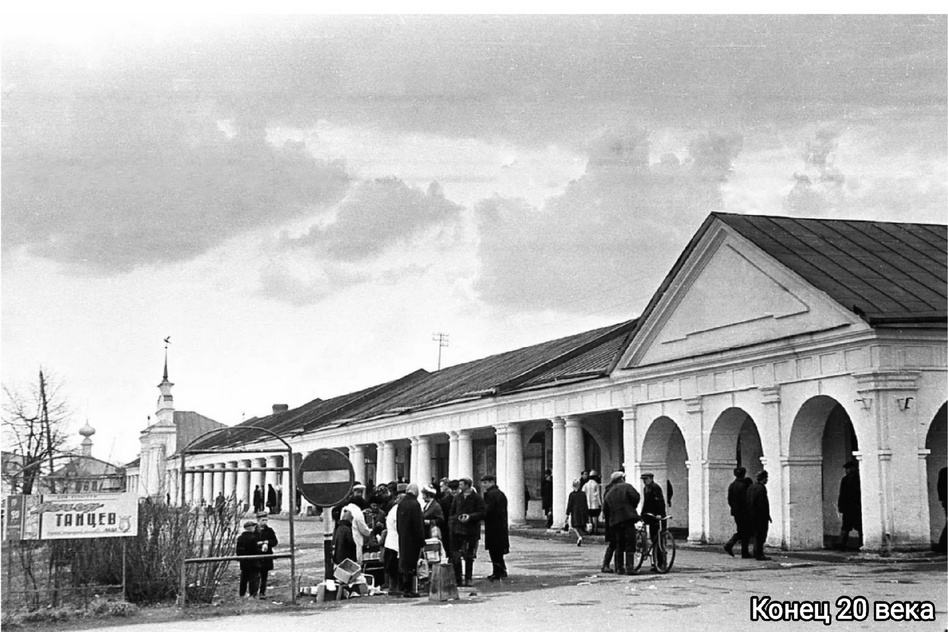 В Киржаче торговые ряды на центральной площади появились в 50-х годах 19 века. Здание красного цвета с белыми вставками выглядело красочно. К фасаду пристроен ряд одинаковых арок, опирающихся на квадратные столбы. Крытая галерея украшена светильниками, оформленными под старину.