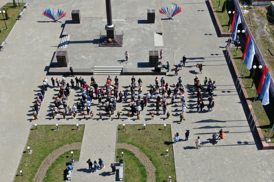 На площади Воинской славы перед стелой ребята выстроились в колонны, образовав слово: ПОМНИМ. У каждого из них в руках были воздушные шары цветов георгиевской ленты – оранжевые и чёрные. В знак уважения и памяти о ветеранах вернувшихся и не вернувшихся с полей сражений они запустили шары в яркое голубое небо.