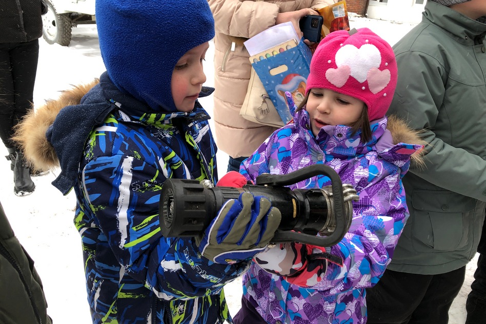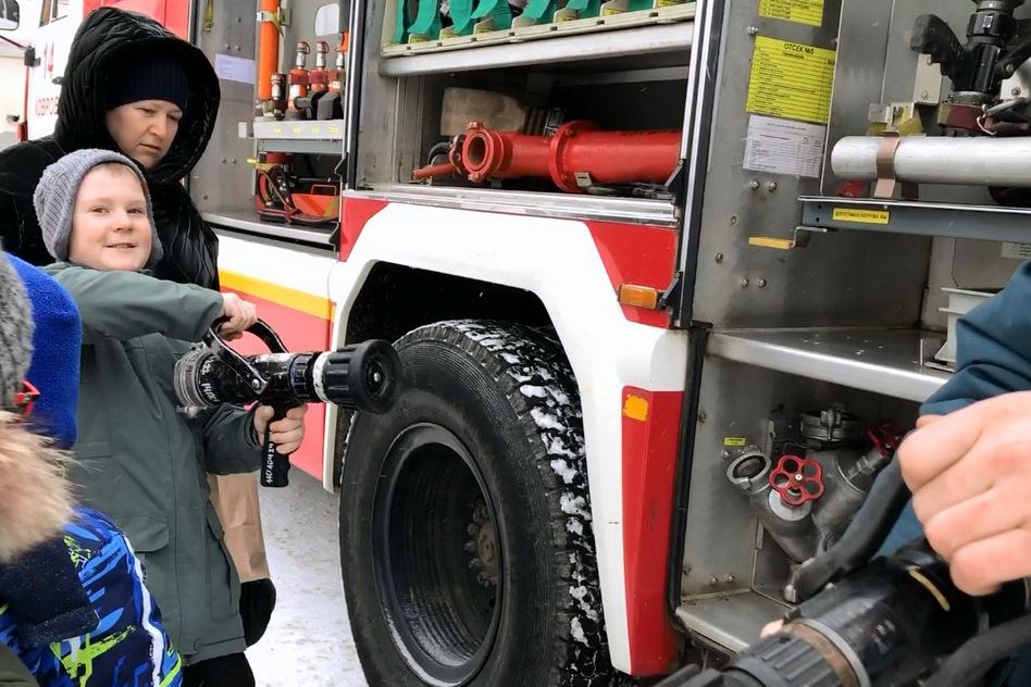 На улице победители конкурса смогли посидеть в кабине боевого расчета, покрутить в руках пожарные стволы, подержать инструменты. А больше всего им хотелось увидеть самою большую машину в городе – автолестницу АЛ50. В разложенном состоянии она достигает длинны 50 метров, достает до 17 этажа.