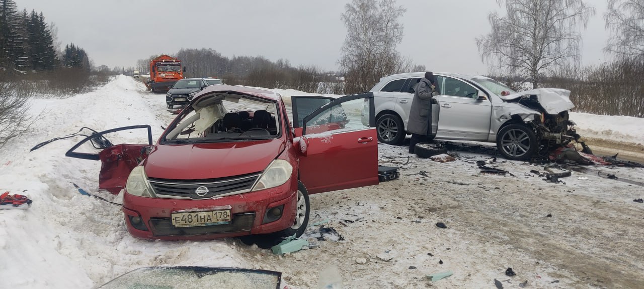 Как сообщили в прокуратуре Владимирской области и региональном УМВД, первая авария произошла сегодня около 12:55 на автодороге Владимир — Кольчугино — Верхние Дворики — Александров . Водитель автомобиля «Ниссан Тиида» 1974 года рождения, двигаясь в сторону Кольчугино, выехал на встречную полосу. Там легковушка по касательной задела большегрузный автомобиль, после чего врезалась в следовавшую за фурой «Ауди Q7» .