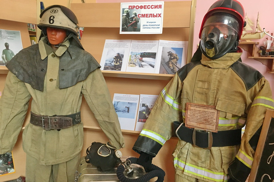 Каждый год перед Днем пожарной охраны в библиотеке выставляются различные экспонаты, имеющие отношение к работе пожарных: боевая одежда нескольких видов, для работы на пожарах, на авариях с выбросом различных химических и радиоактивных веществ, аварийно-спасательный инструмент, дыхательные аппараты, фотографии с мест ЧС.