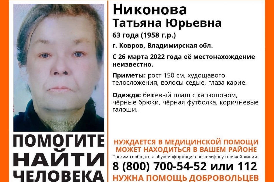 Пропала Никонова Татьяна Юрьевна 1958 г.р. (63 года), Ковров, Владимирская обл.