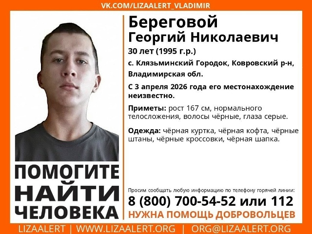 В Ковровском районе Владимирской области четвёртый день ищут 30-летнего мужчину. Георгий Николаевич Береговой, 1995 года рождения, проживающий в селе Клязьминский Городок, перестал выходить на связь с 3 апреля 2026 года. С этого момента его местонахождение остаётся неизвестным.