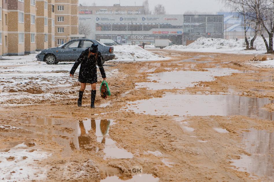 Работы по вывозу снега ведутся плохо не только во дворах. После потепления дороги и тротуары размыло. Снег вовремя не убрали и не вывезли из-за этого некоторые улицы затопило.
