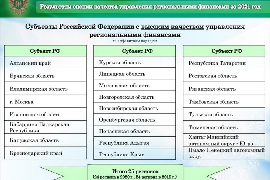 На протяжении 3 лет высоким качеством управления региональными финансами характеризуются следующие субъекты Российской Федерации: