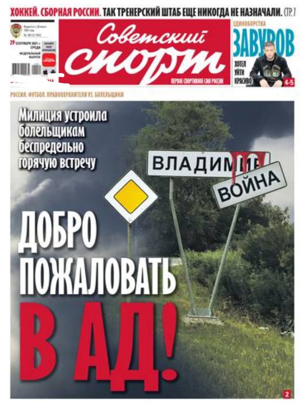 Популярность сомнительного свойства. Ранее GK сообщал со ссылкой на канал «Подъём» о задержании во Владимире футбольных болельщиков сотрудниками полиции. И вот, в паблике «Подслушано во Владимире» скрин-шот газеты «Советский спорт» с броским заголовком «Добро пожаловать в ад». И это о нашем областном центре…