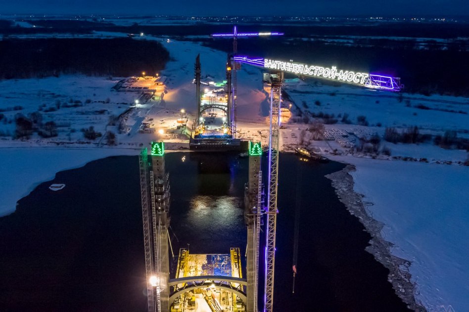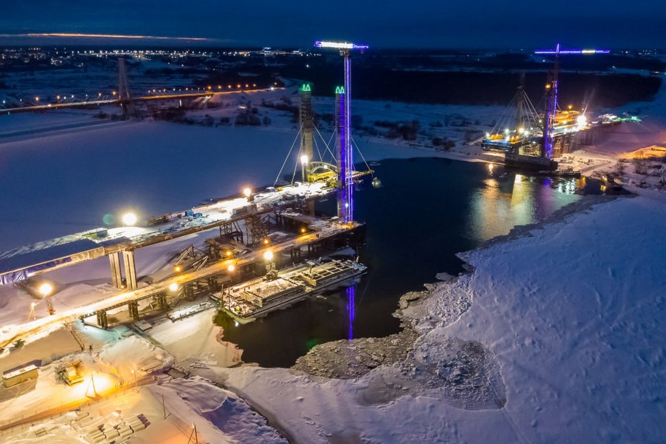 На внеклассном вантовом мосту через Оку соединит Владимирский и Нижегородский берега. на 4 этапе строительства М-12 работа не останавливалась в Новый год. Сейчас, несмотря на 30-ти градусный мороз, мостовики ведут подготовку к монтажу ещё одной пары вант. Уже смонтировано 12 и 34 пар вант. Левый русловой полупролет (консоль) моста смонтирован на половину длины, правый — на четверть.