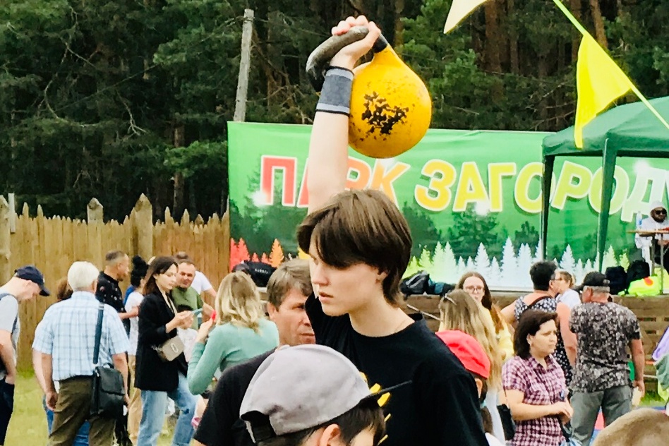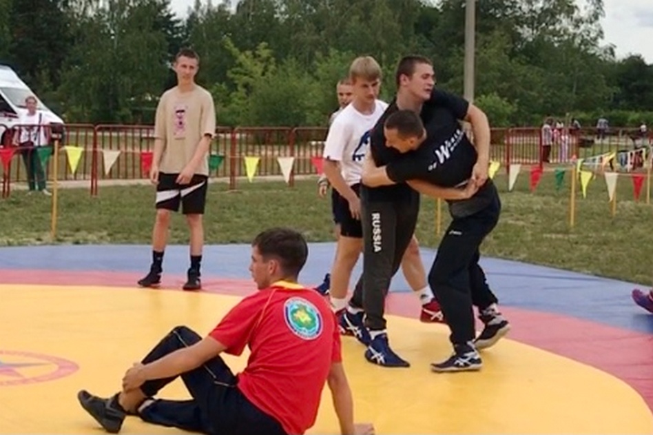 А на лужайке перед входом на территорию Дуралеевки отгородили несколько территорий цветными флажками, где проходили различные спортивные мероприятия. Слева в зоне с гиревым спортом меня удивило присутствие среди участников девочек, которые справлялись так же удачно, как и мальчики. Справа – разместили татами, на котором выступали спортсмены национальной борьбы на поясах «Куреш».