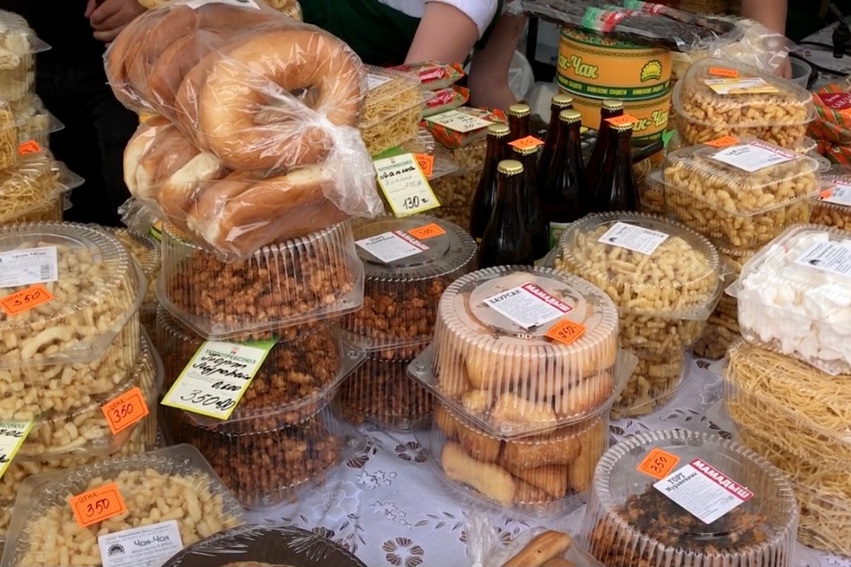 А мне же всё интересно. Вижу, чуть в сторонке девушка держит в руках прозрачную упаковку с чем-то вкусненьким, и одну штучку уже кушает. Ну, я и подошла спросить, что это такое. Она сказала – похоже на пончики в меду. Потом я купила их. И называются они Баурсак – один из видов чак-чака. По вкусу сладко, но внутри суховато. Хотя если с чаем или, лучше того, с горячим молоком – мммм, вкусненько. Эта сладость делается из теста действительно очень похоже на пончики, только форма другая, а внутри такие же воздушные. Сначала их обжаривают, а потом окунают в растопленный мёд. Мёд частично впитывается и образует очень приятную вкусную мягкую корочку. Одним словом, лучше один раз попробовать, чем много раз читать описание.