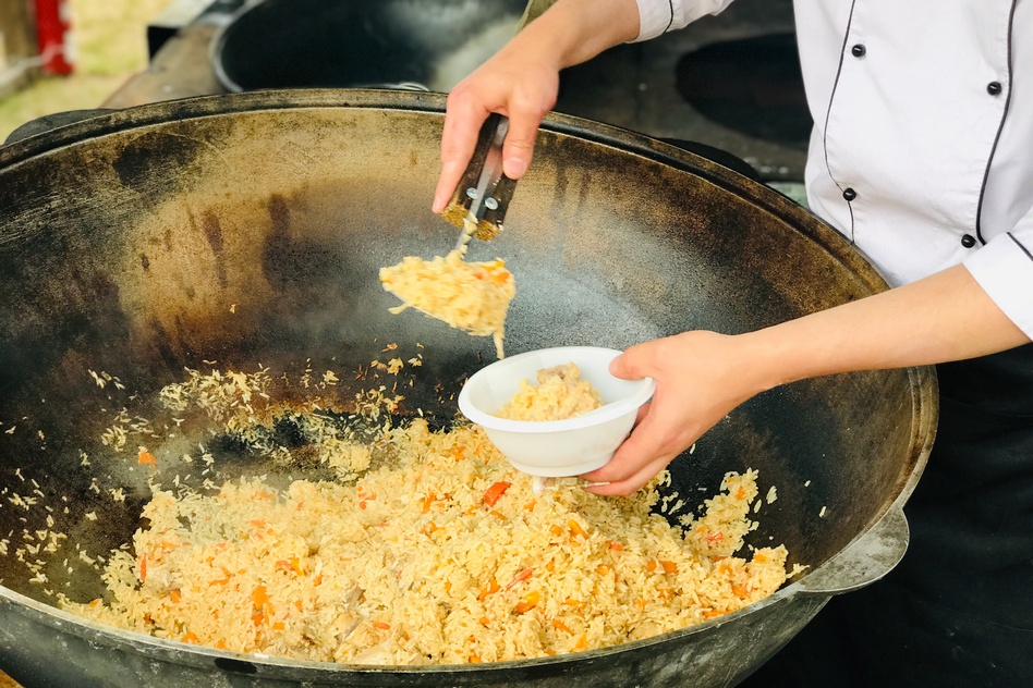А внутри… Множество разных палаточек с традиционными кушаниями и сладостями. Чак-чак, мёд, напитки, еда, названия которой я даже не знаю – я-то русская, поэтому не знакома ни с татарскими обычаями и традициями, ни с их национальной кухней. Единственное, что знаю – это плов. За которым, к слову, выстроилась такая большущая очередь! А ребята и девчонки очень быстро, просто молниеносно успевали всех обслужить, всем подать тарелочки с горячим и ароматным пловом, выпечку и чай.