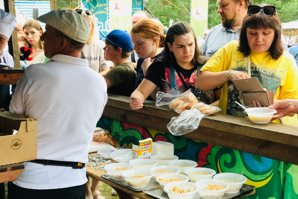 Люди улыбаются, встречают знакомых, активно покупают предлагаемые вкусняшки, участвуют в конкурсах и соревнованиях.