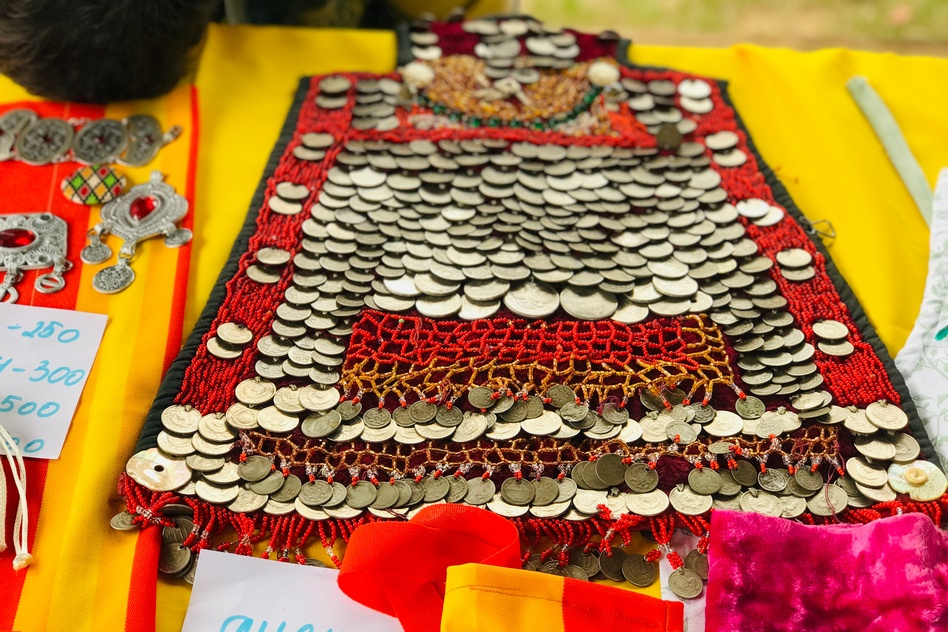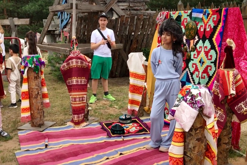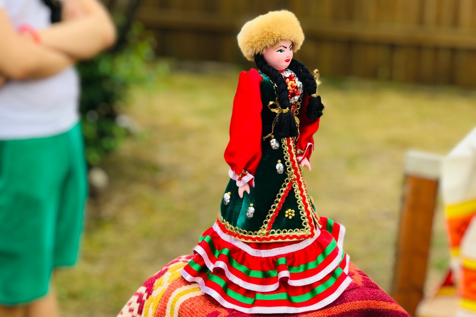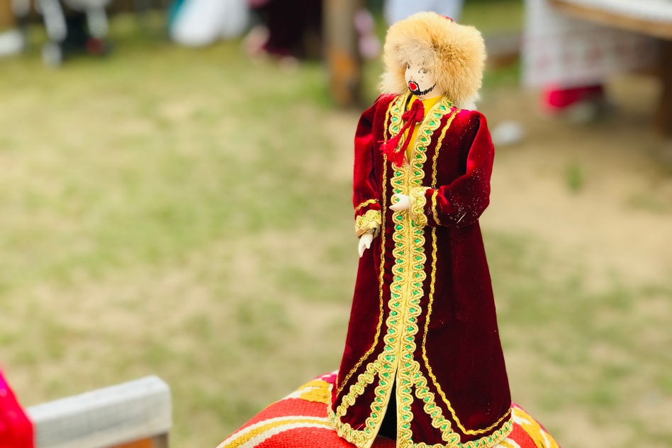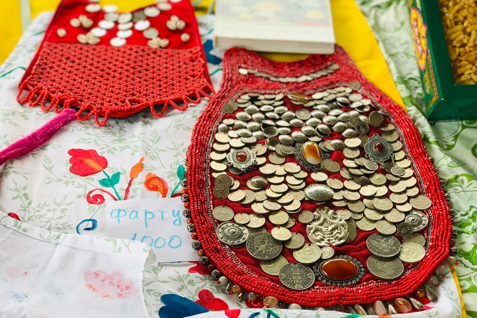 В глубине площадки разместили фото-зону – яркую, атмосферную. Из домотканых половиков-дорожек, с национальными шапками, в которых можно было фотографироваться (с натуральными лисьими хвостами, между прочим), тюбетейками, украшениями с монетками. Монетки, кстати, самые настоящие – денежки. Фото-зона пользовалась большой популярностью, особенно у детей.