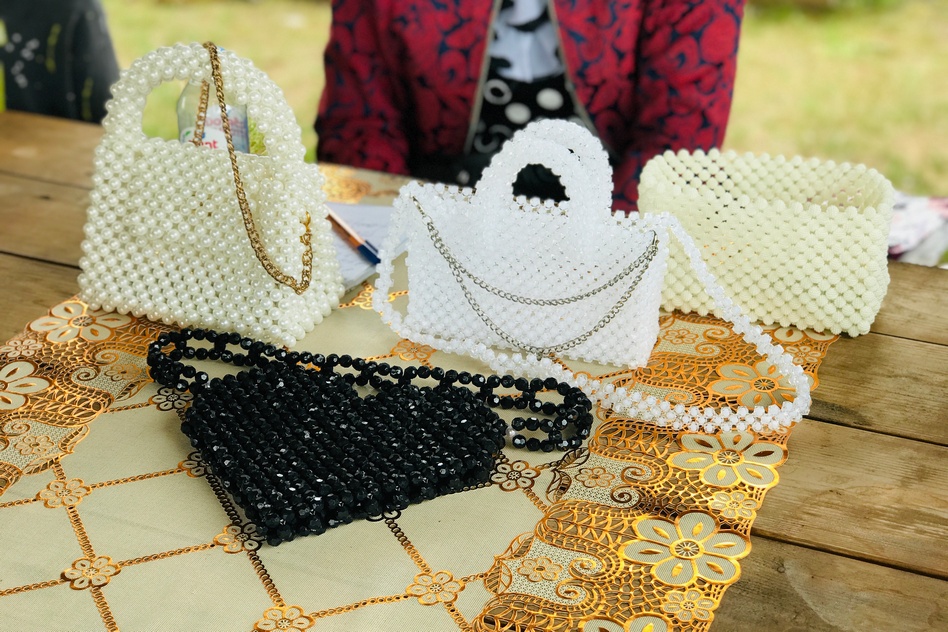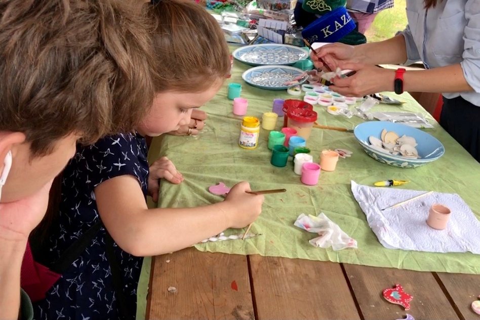 Здесь же рядом, справа от фото-зоны расположились мастера со своими творениями. Бусы, сумочки ручной работы из бусин, фартуки с монетками и натуральными камнями, чаи, книги, чётки – множество всего, чего только можно придумать. А так же мастер-классами. Девочка, совсем маленькая, с таким увлечением занималась росписью. И было видно, насколько ей это интересно.