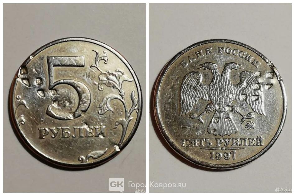 Монета номиналом в пять рублей имеет производственный брак, такие несовершенства особенно ценятся среди нумизматов. Уникальный экземпляр был отчеканен в 1997 году. Долгое время она хранилась в частной коллекции, а сейчас выставлена на продажу на Авито.