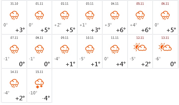 По предположениям синоптиков,первая половина ноября будет холодной и дождливой, а местами даже возможен снег. В период с 1 по 6 ноября температура составит от +3 до +4. Но уже с 7 ноября температура начнет опускаться до -3 градусов.