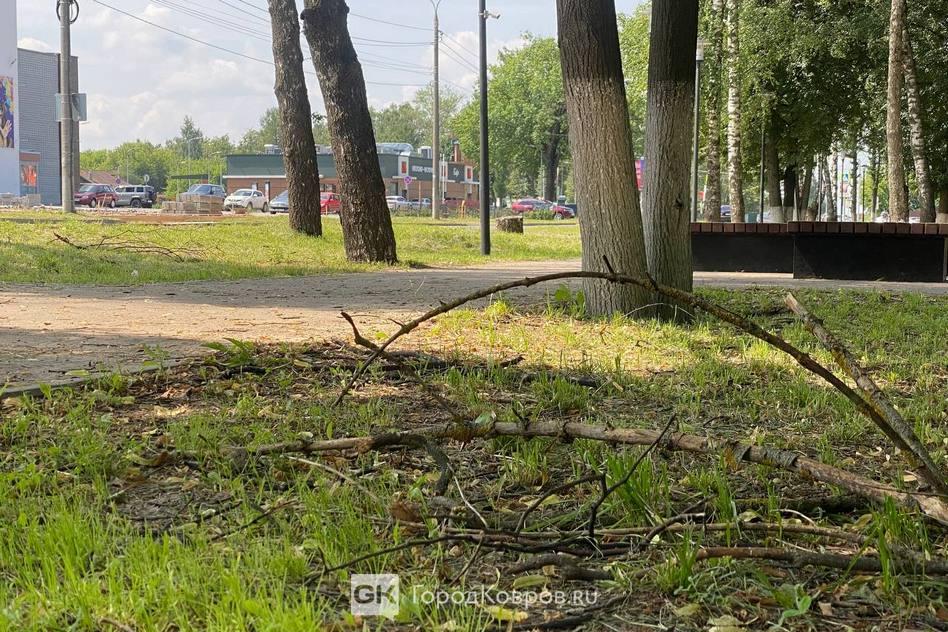 Так, несмотря на то что в прошедшие несколько дней сильного ветра не наблюдалось, в сквере у площади 200-летия Коврова разбросаны крупные ветки, скорее всего не убранные после гроз.
