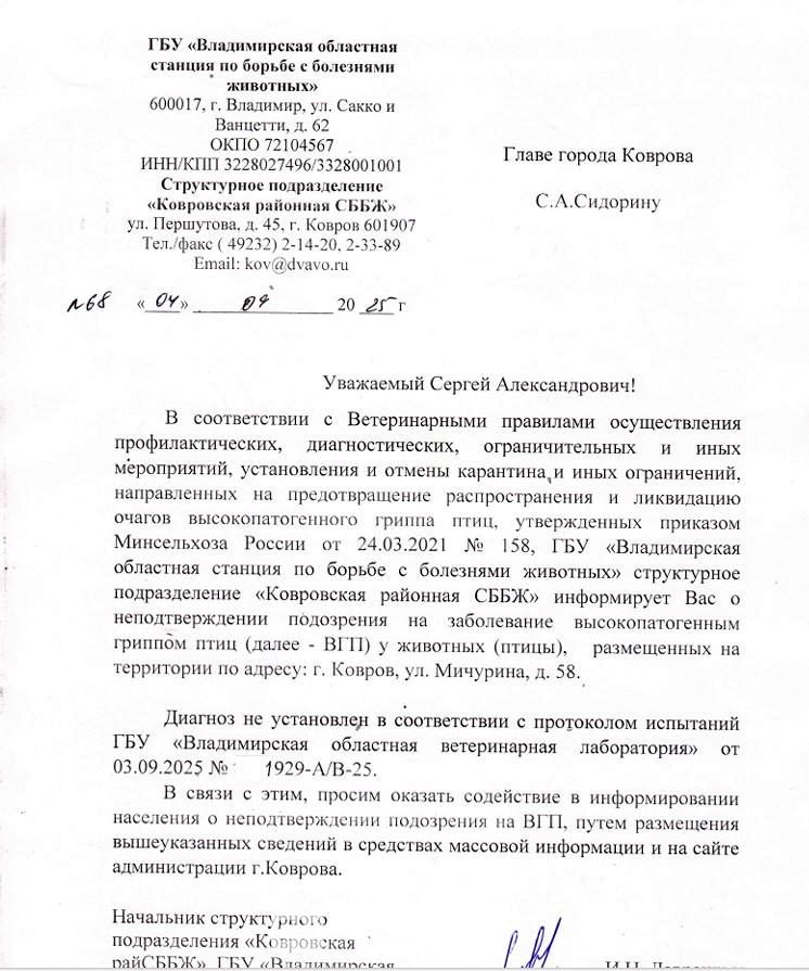 Поскольку птичий грипп является серьёзным заболеванием, а его эпидемия является проблемой городского уровня, ответ из областной станции по бобрьбе с болезнями животных пришёл в адрес главы города Сергея Сидорина.
